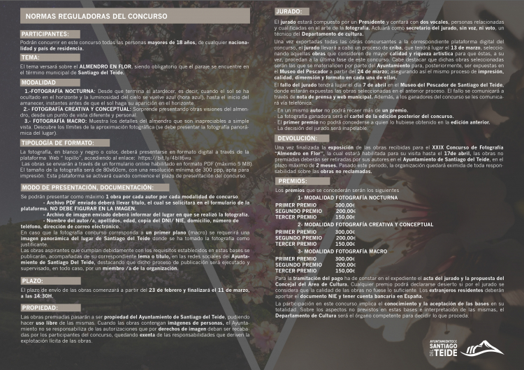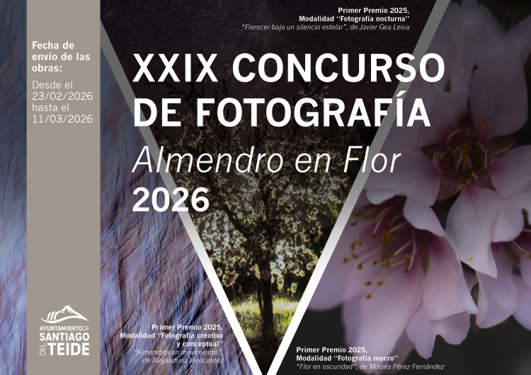 El Ayuntamiento de la Villa Histórica de Santiago del Teide convoca el XXIX Concurso de Fotografía “Almendros en Flor 2026”, con el objetivo de poner en valor el paisaje, la naturaleza y la creatividad fotográfica en torno al almendro en flor dentro del municipio. Podrán participar todas las personas mayores de 18 años, de cualquier nacionalidad y país de residencia.